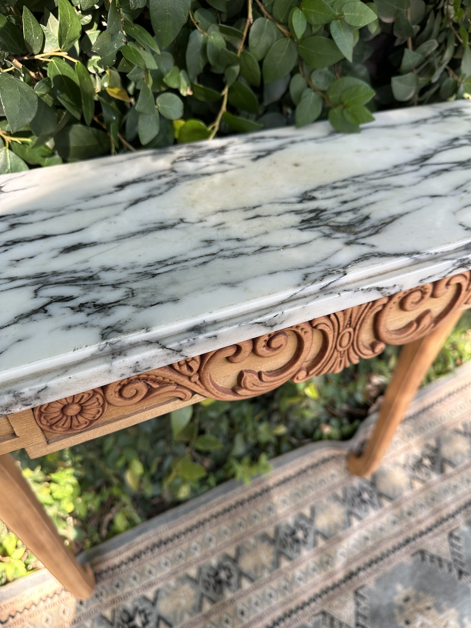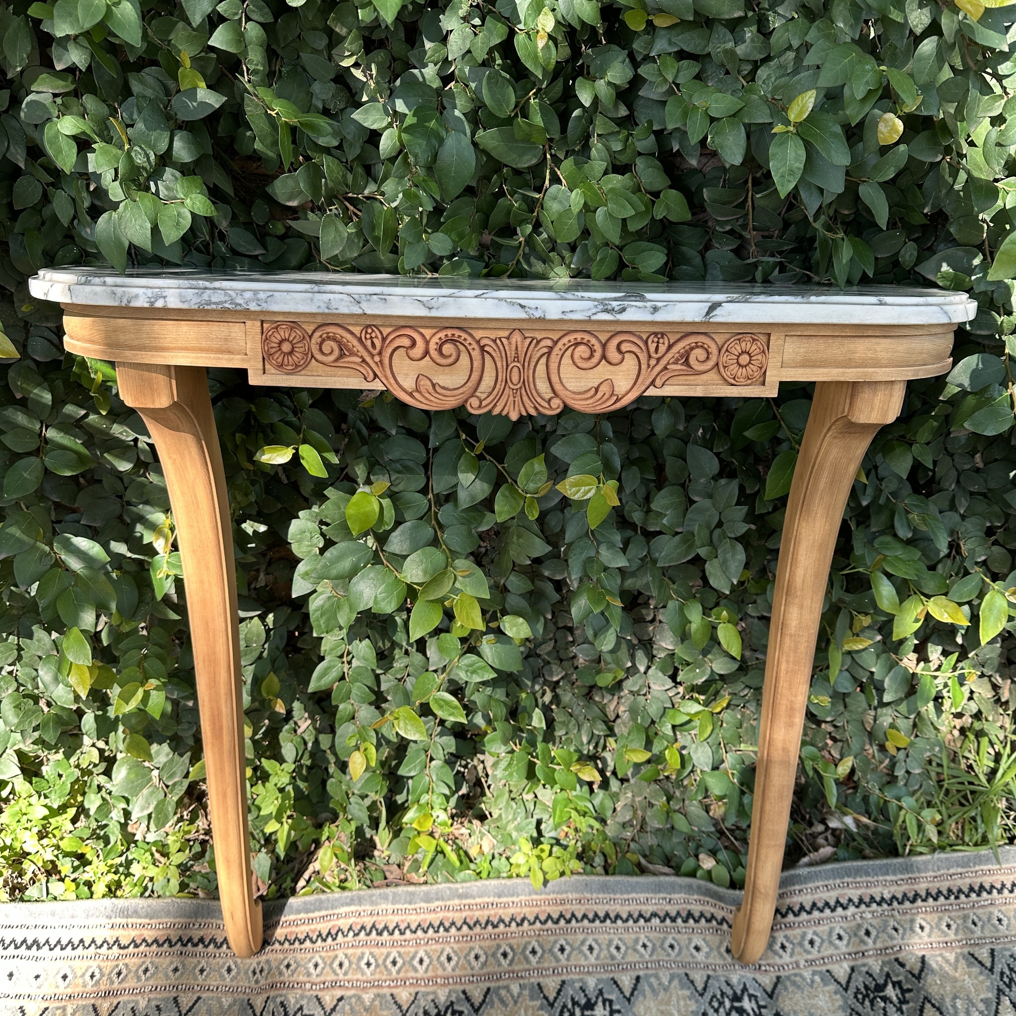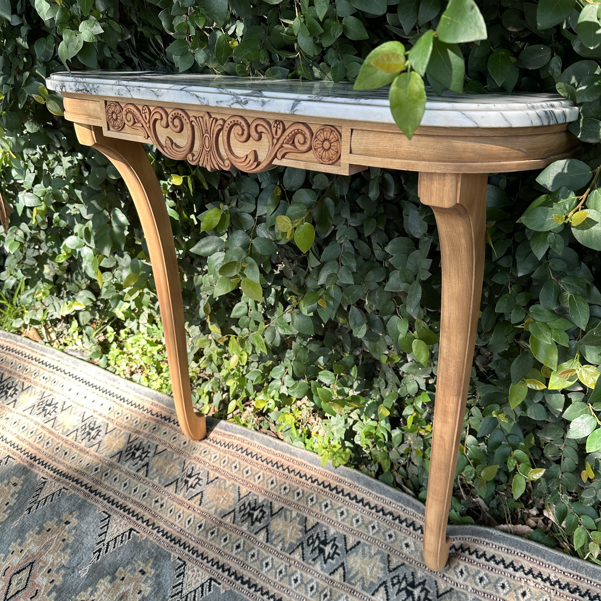 Consola mural estilo Luis XV. Elegante consola de apoyo realizada en madera tallada a mano, con frente decorado en motivos de rocalla y roleos propios del repertorio rococó. Se apoya sobre dos patas cabriolé estilizadas, de trazo fluido y refinado, que refuerzan su carácter clásico y ligero. La tapa de mármol blanco veteado, de líneas suavemente curvadas, aporta luminosidad y contraste al conjunto. Una pieza de lustre renovado, ideal para recibidores, salones o pasillos, que combina funcionalidad con un aire distinguido de inspiración francesa.