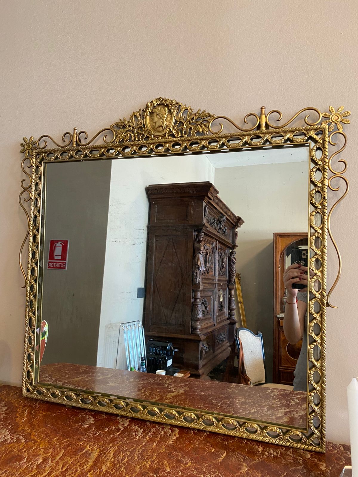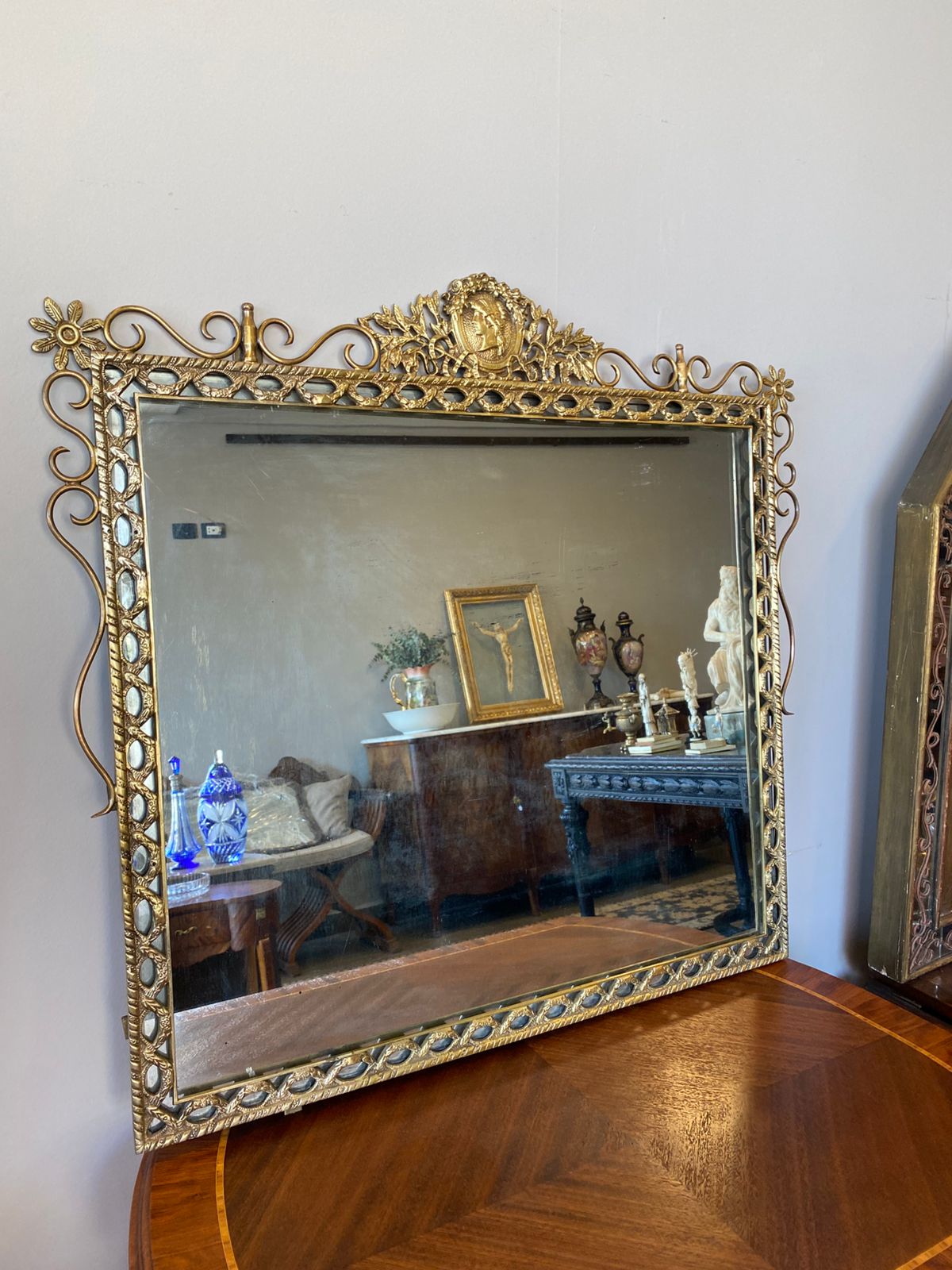 Antiguo espejo de forja artesanal en bronce. Estilo transición Luis XVI. Marco con diseños de araberscos, listras de laureles y coronamiento con busto de un guerrero.