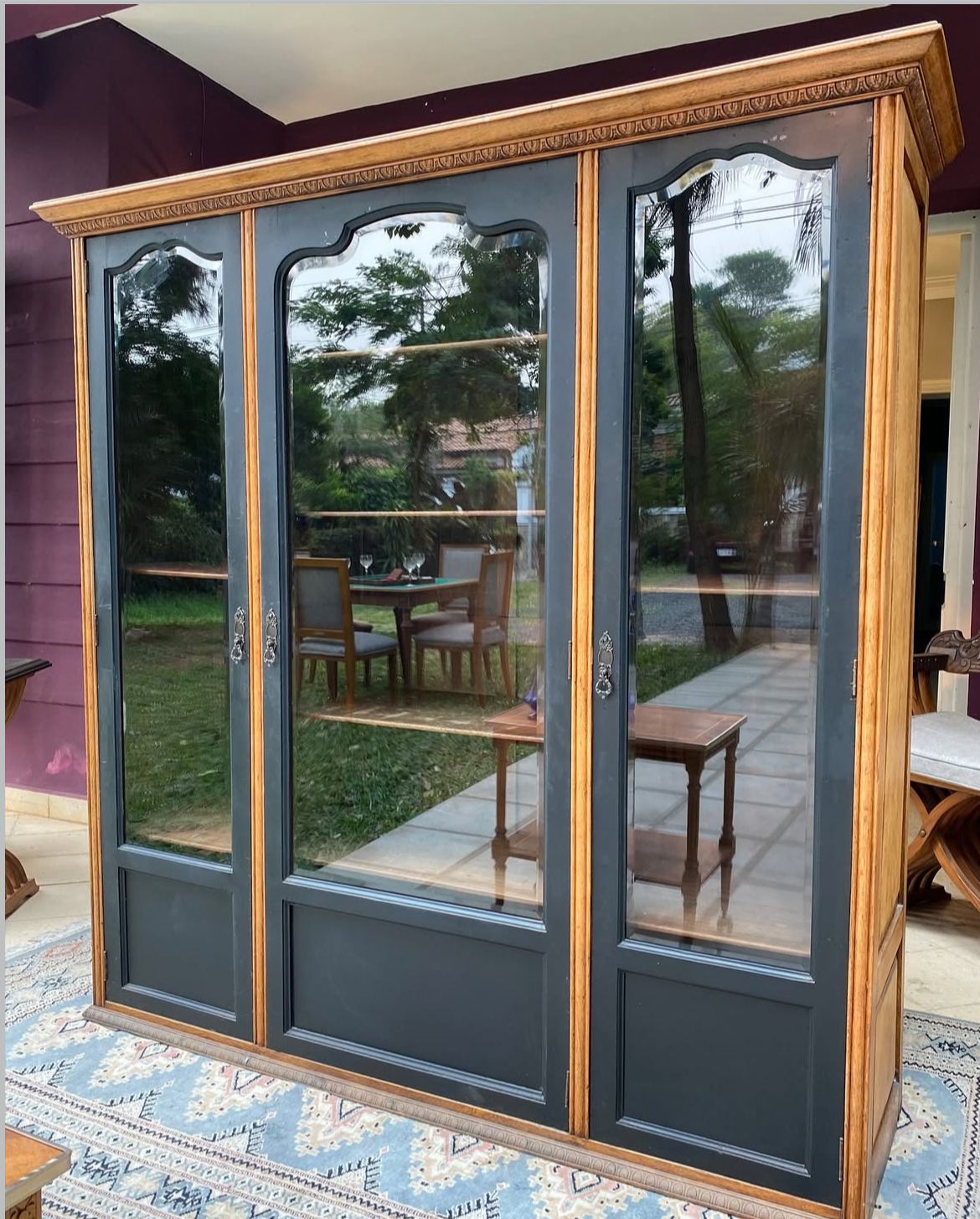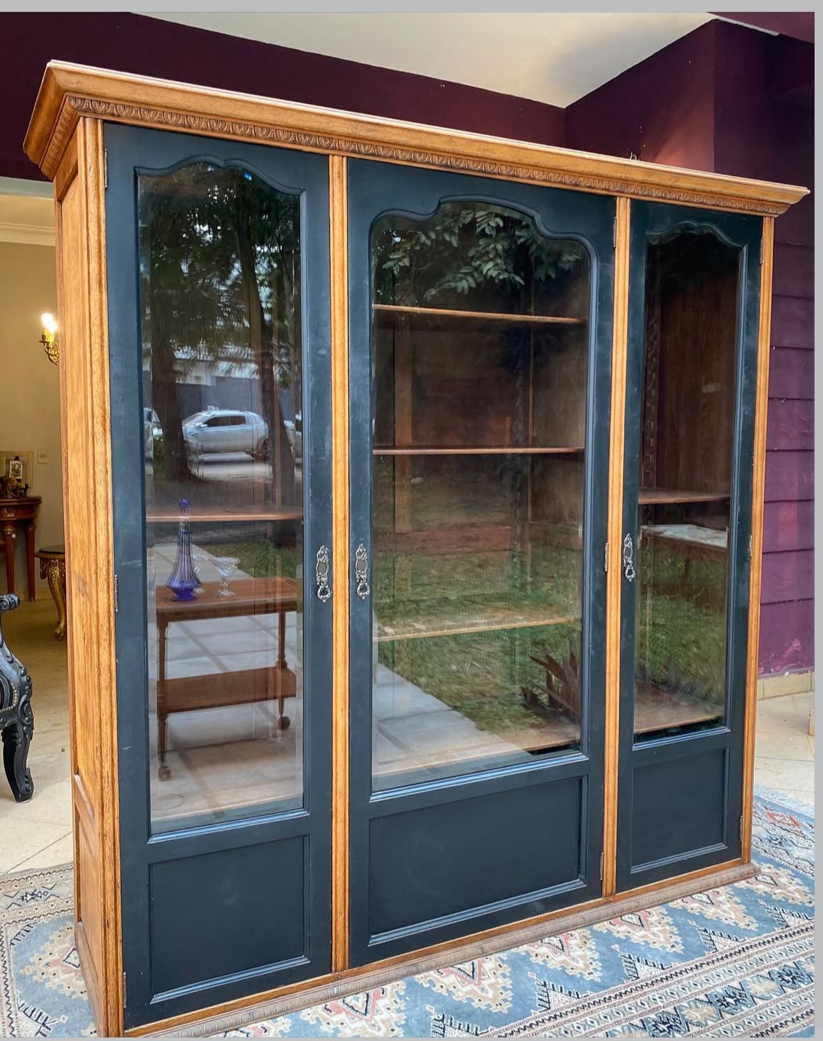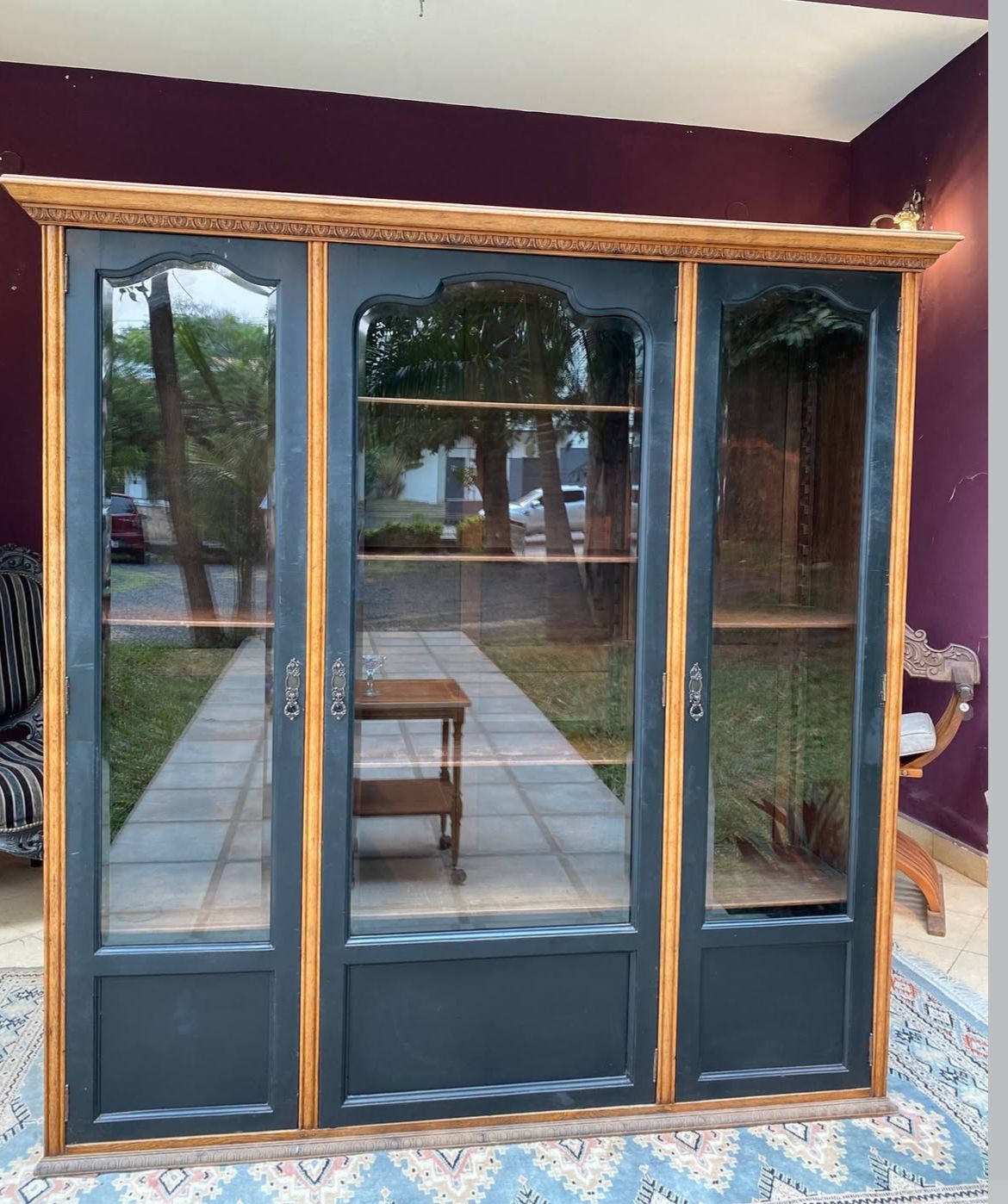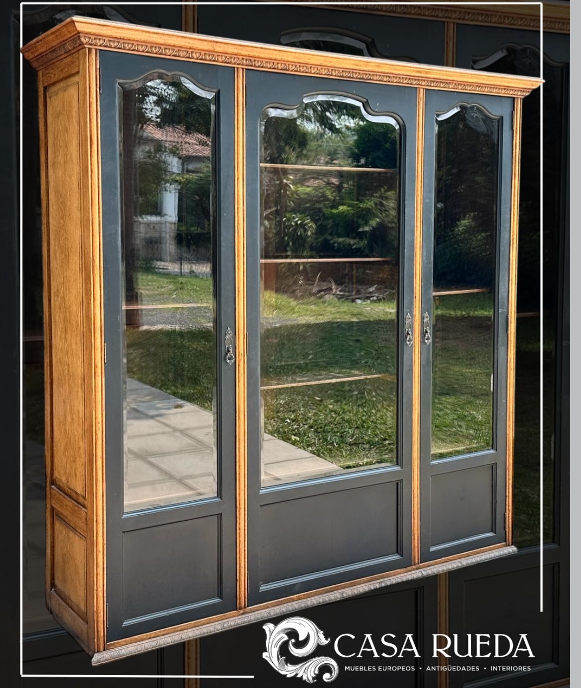 Gabinete estilo Provenzal en roble. Especial para bar, biblioteca o vitrina. Frente con vidrios originales biselados y tallas a mano de guardas. Los estantes son ajustables las alturas.