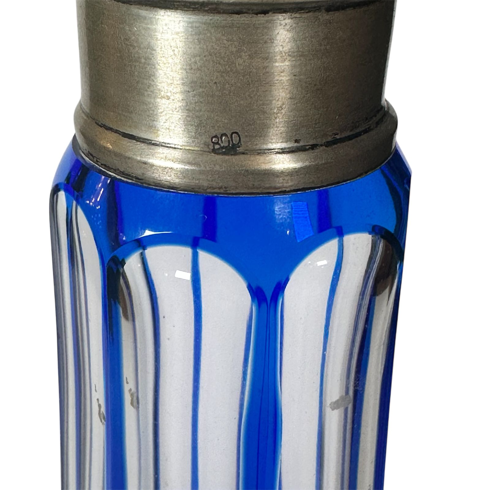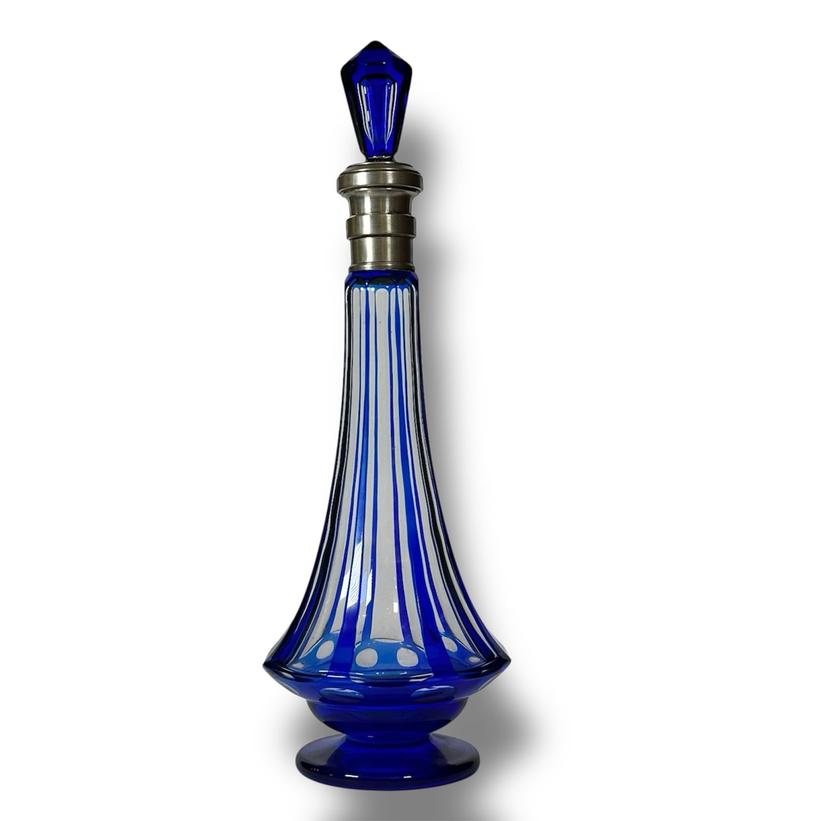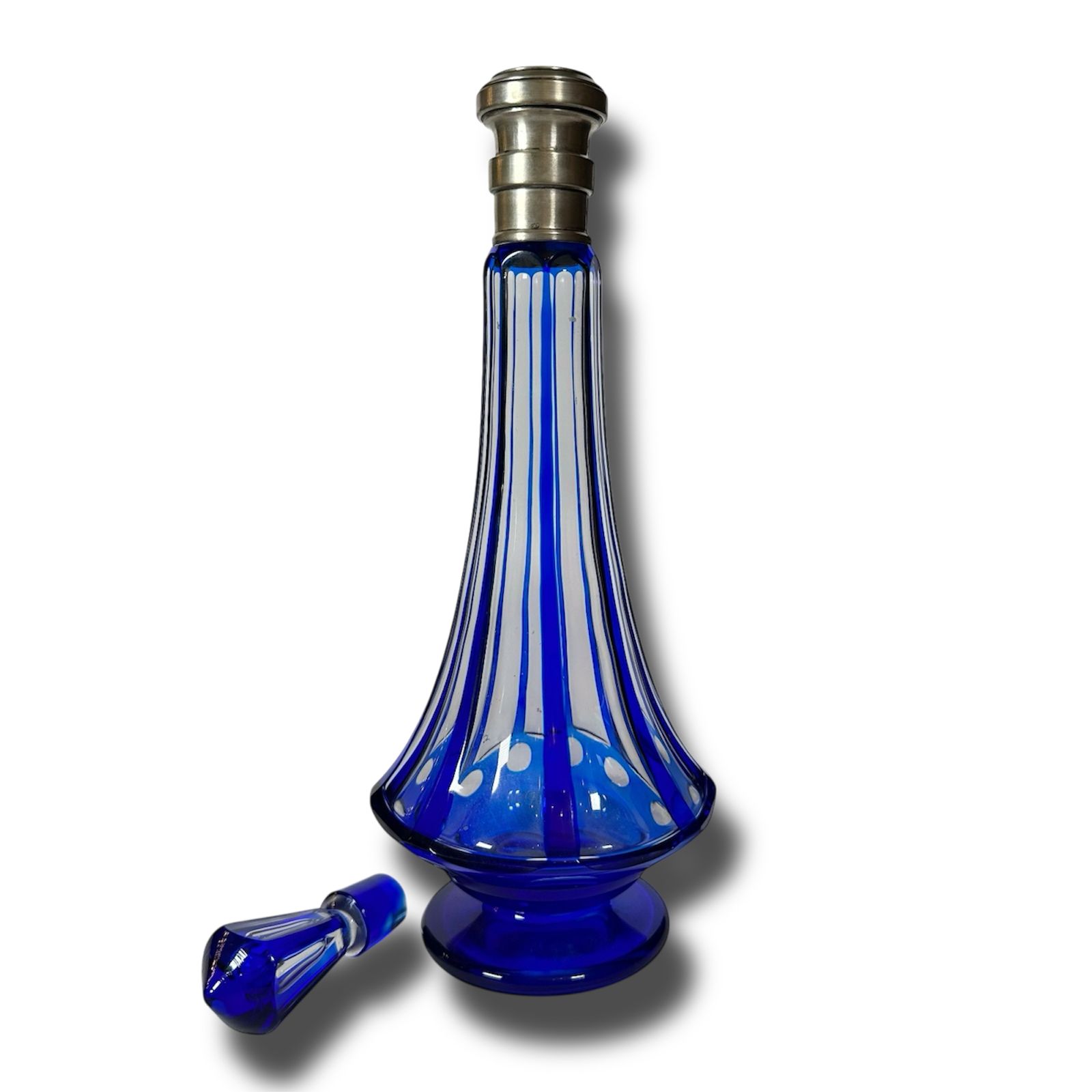 Licorera en cristal camafeo. Técnica de doble capa calada en tonos de transparencia y azul. Cuello con anillo en plata y tapa haciendo juego.