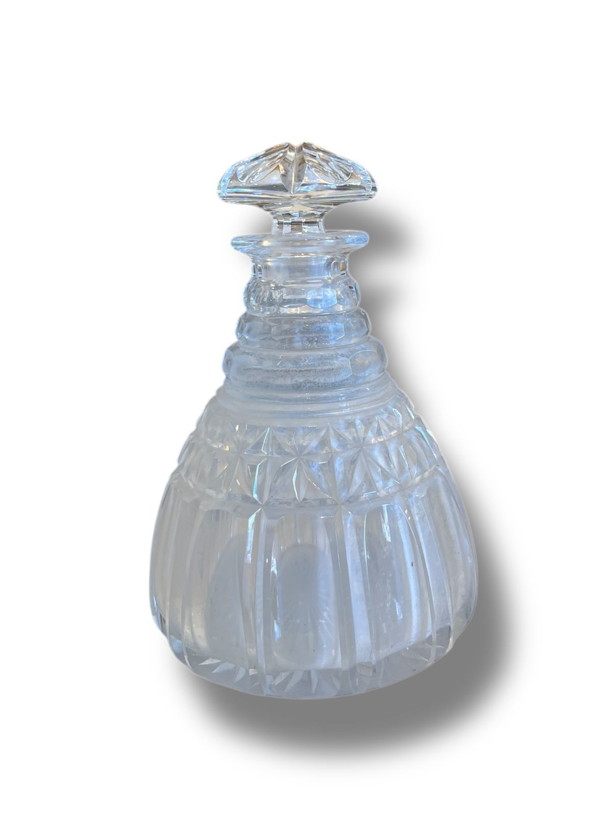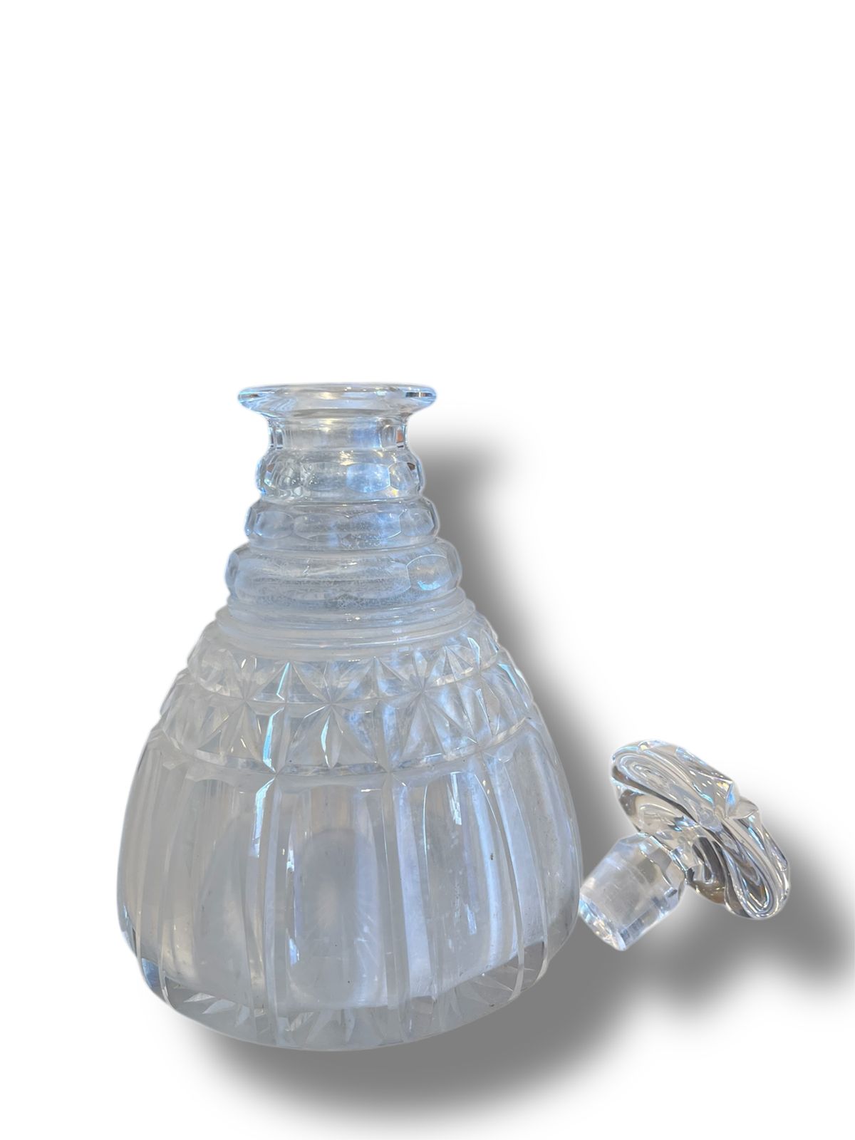 Licorera en cristal moldeado y tallado con tapón a juego. Su diseño facetado presenta cortes geométricos combinados con motivos estrellados en la base, lo que genera bellos reflejos al contacto con la luz. El cuerpo abombado y de base amplia asegura estabilidad, mientras que el cuello eslabonado y el tapón facetado realzan su carácter elegante. El interior conserva ligeros signos propios de su antigüedad, como veladuras y manchas del tiempo, que no afectan su uso ni su hermosura. Una pieza ideal para lucir en bares, vitrinas o mesas de apoyo.