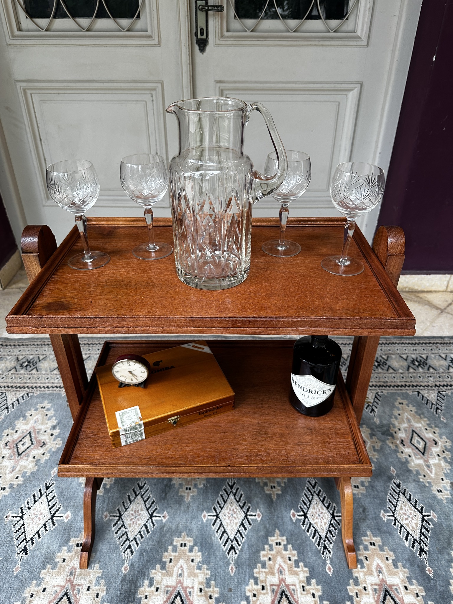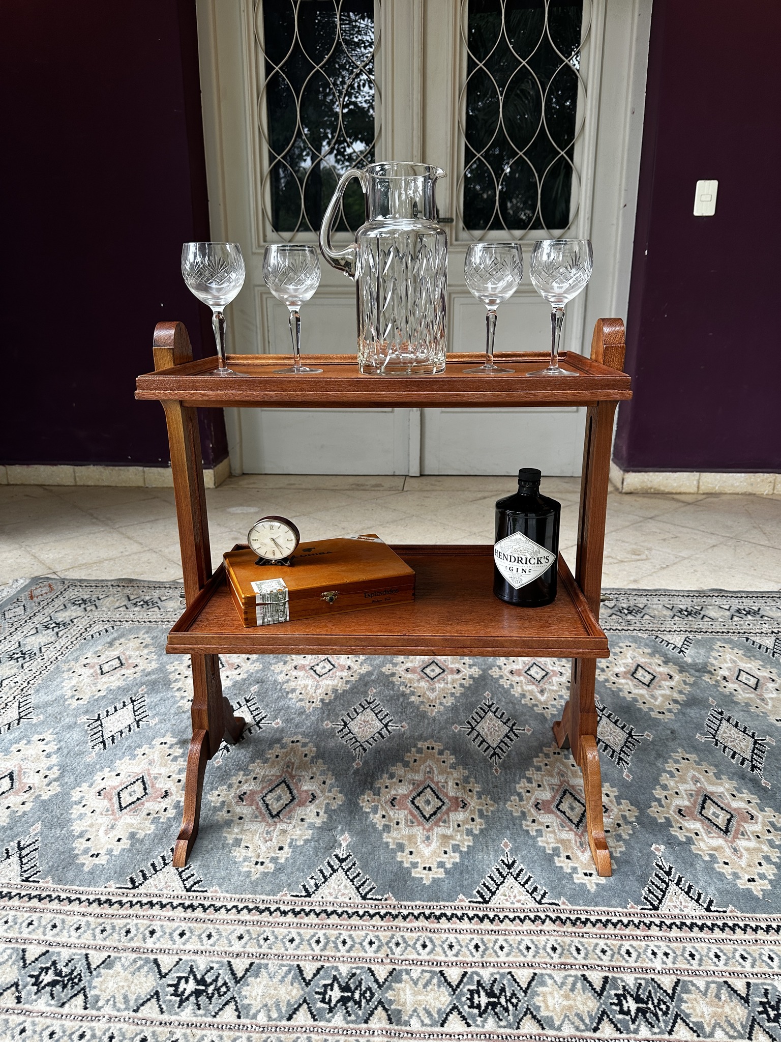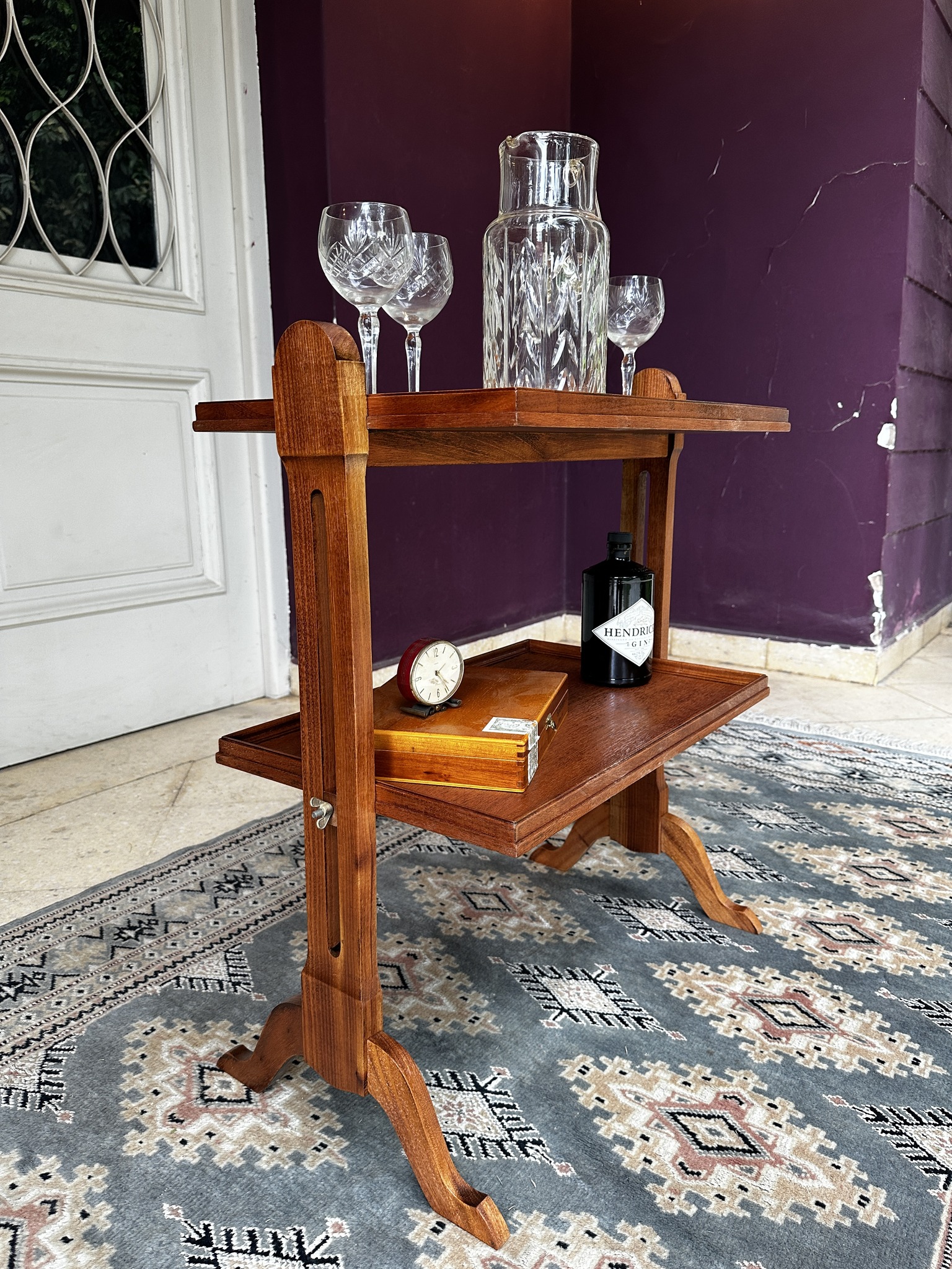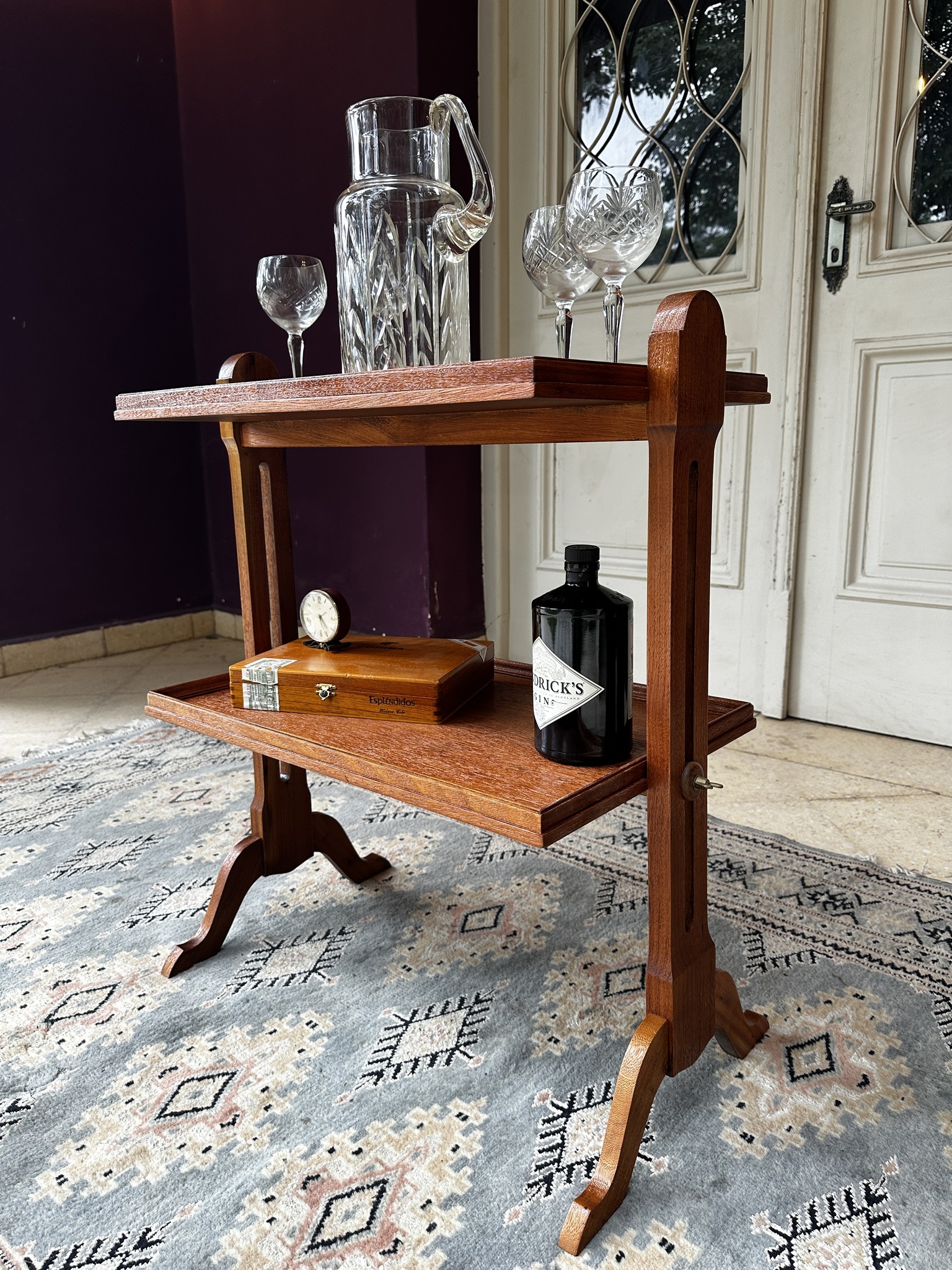Mesa auxiliar de estilo Regencia Sheraton. Con dos niveles, tapa tipo bandeja moldurada y patas curvas. Incorpora mariposas laterales de nivelación que permiten regular con sutileza la altura de la bandeja inferior, aportando versatilidad sin sacrificar elegancia. Su diseño refinado y proporciones ligeras evocan la sofisticación del mobiliario inglés del siglo XIX. Ideal para espacios clásicos y distinguidos.