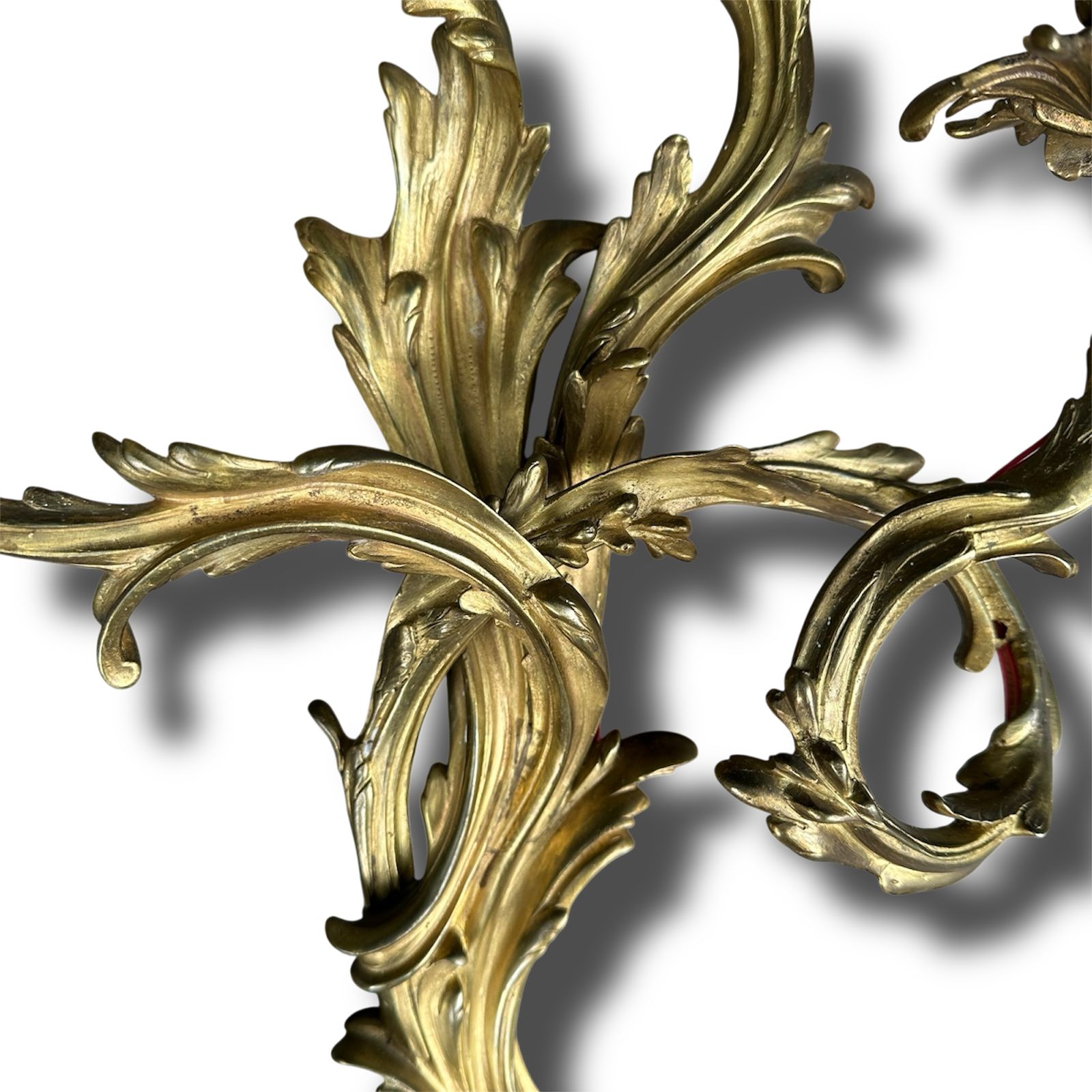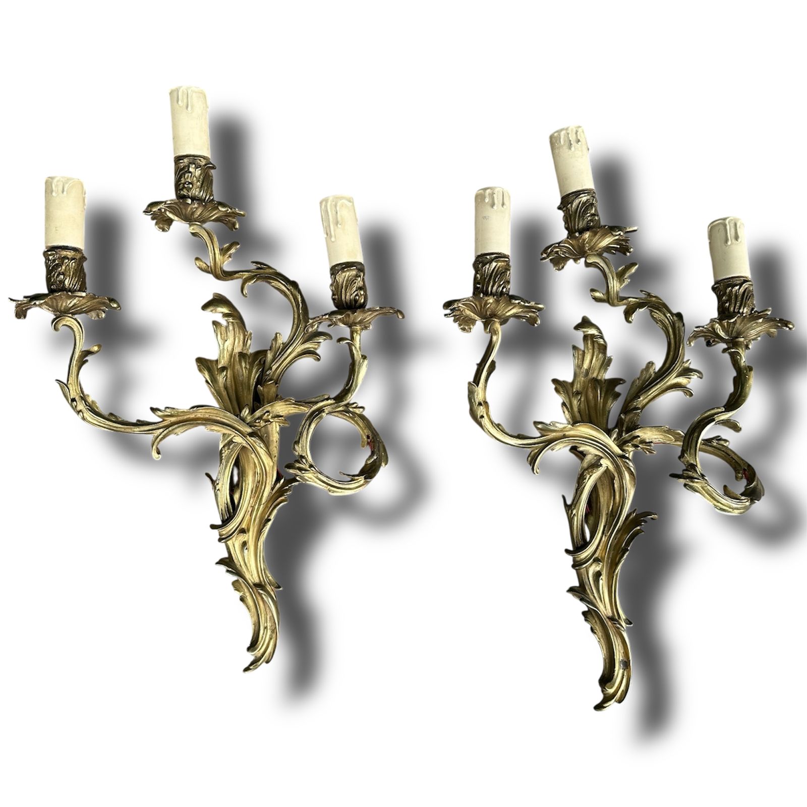 Par de apliques de pared estilo Luis XV en bronce dorado. Piezas de gran refinamiento trabajadas en bronce macizo, con un diseño asimétrico de follajes y curvas rocaille, característico del Rococó francés. Cada aplique cuenta con tres brazos de curvas orgánicas que sostienen portavelas para focos, terminados en delicados bobeches labrados. La estructura combina movimiento y ligereza, otorgando un aire señorial y elegante a cualquier espacio. Cableado renovado, listos para colocar.