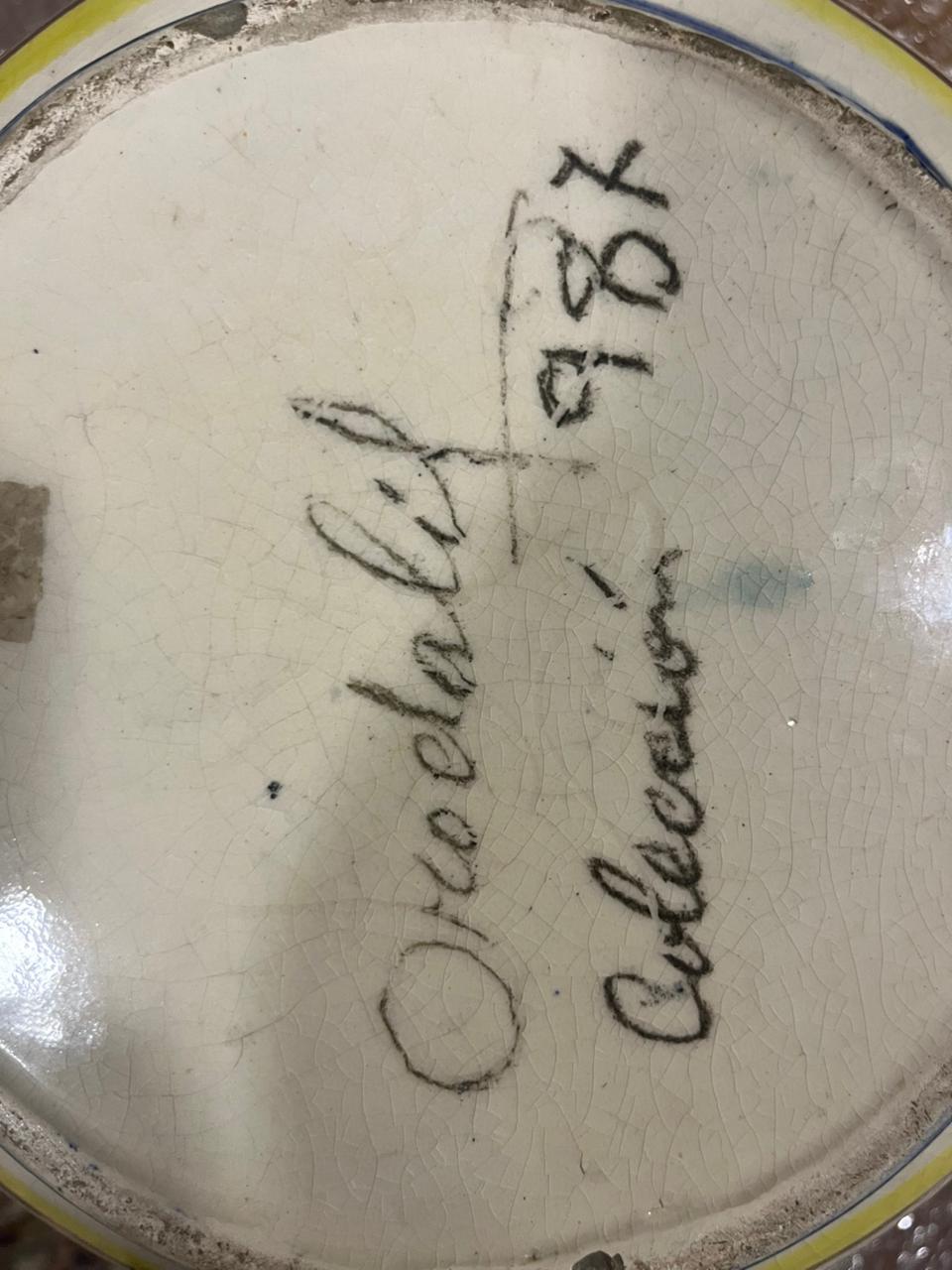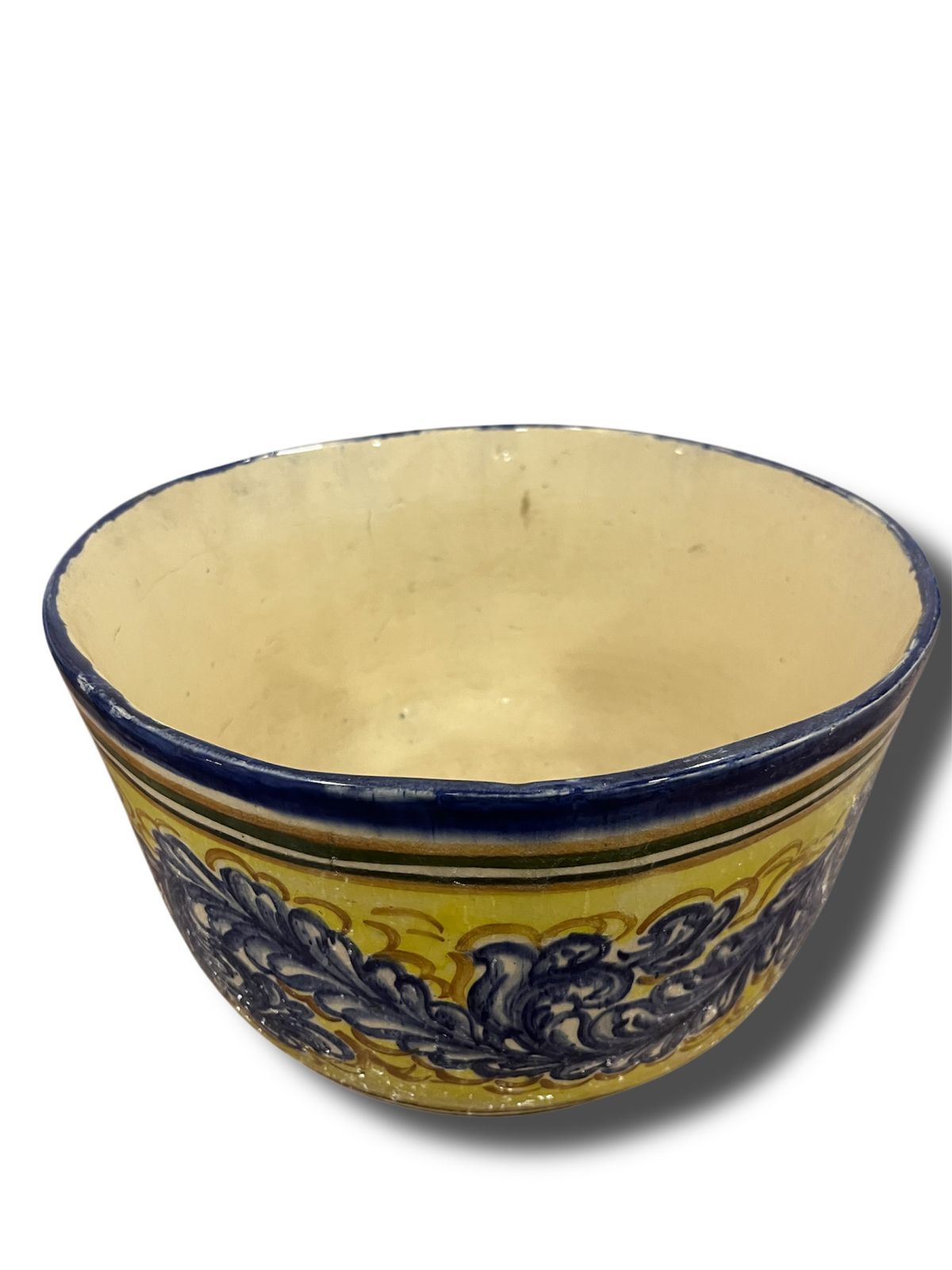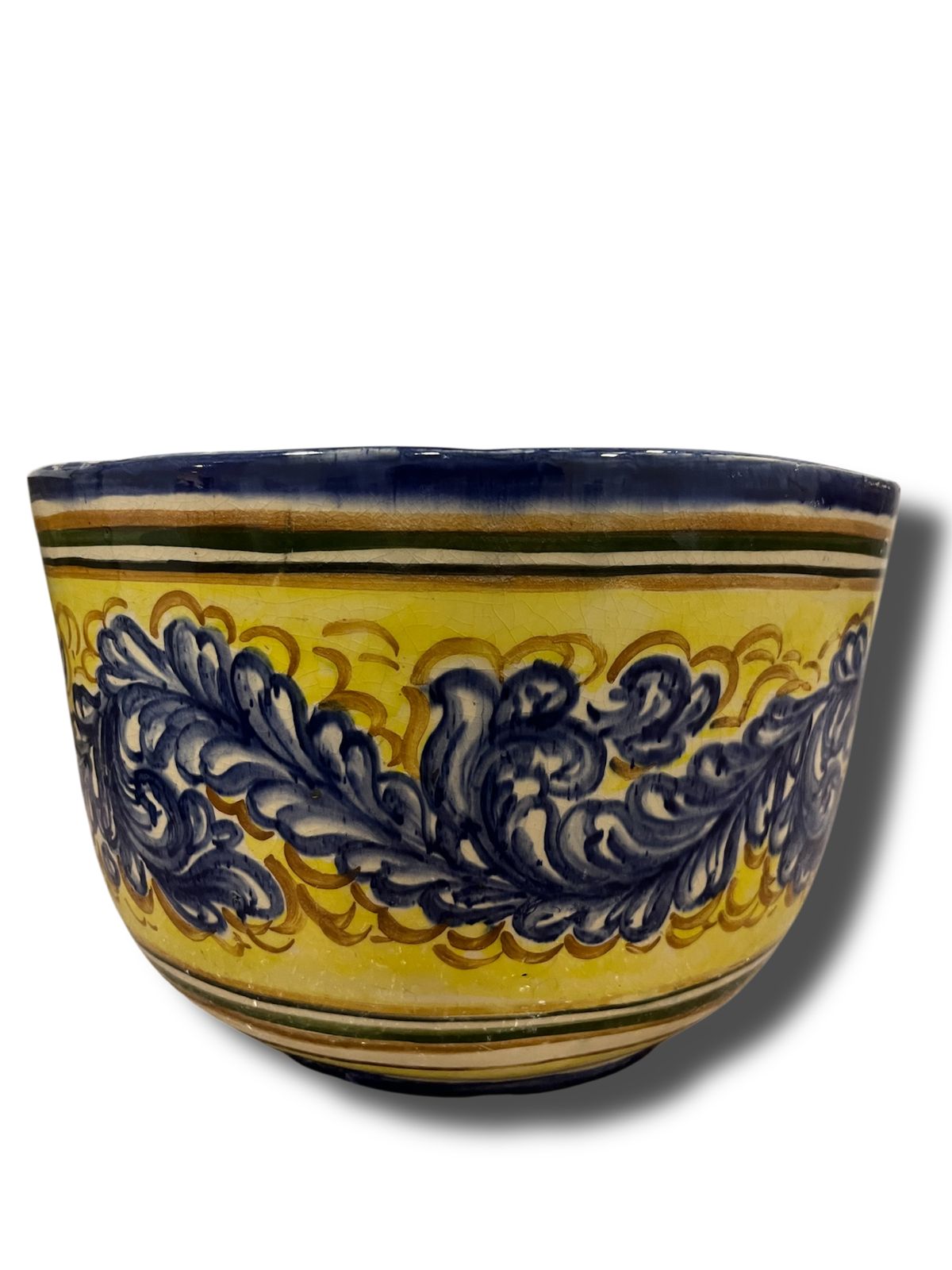Antigua plantera española en porcelana pintada a mano. Diseños de arabescos en vívidos tonos azules sobre fondo amarillo pastel.